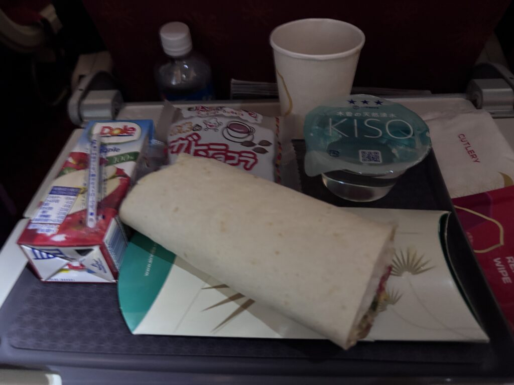 野菜のラップサンド(Wrap)、お米でつくった甘いスナックとリンゴジュースでした。